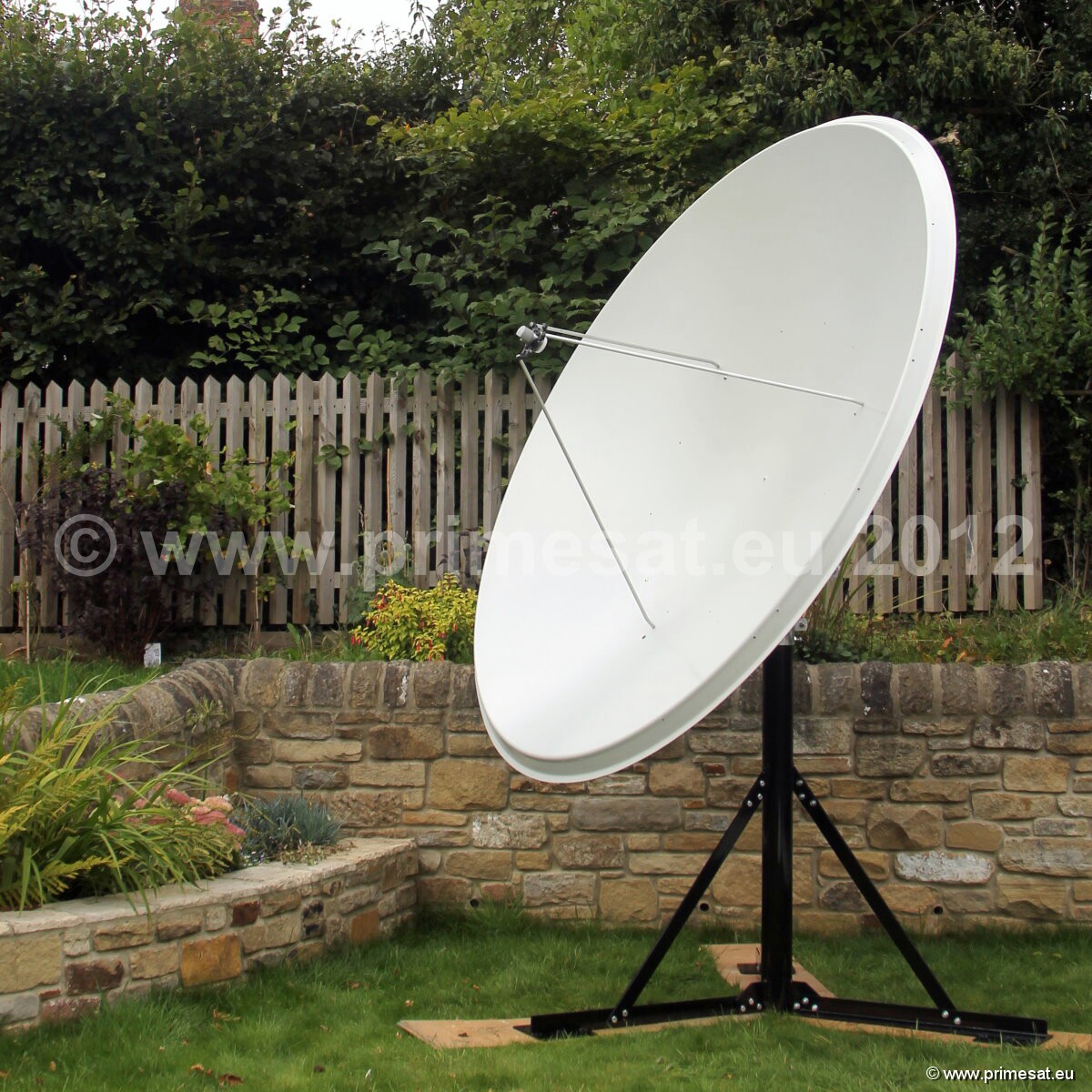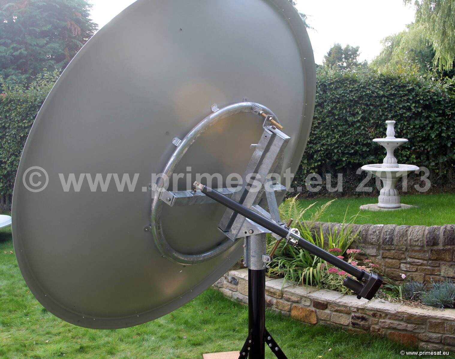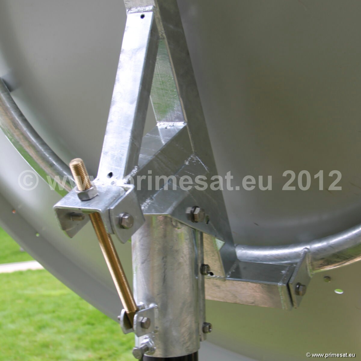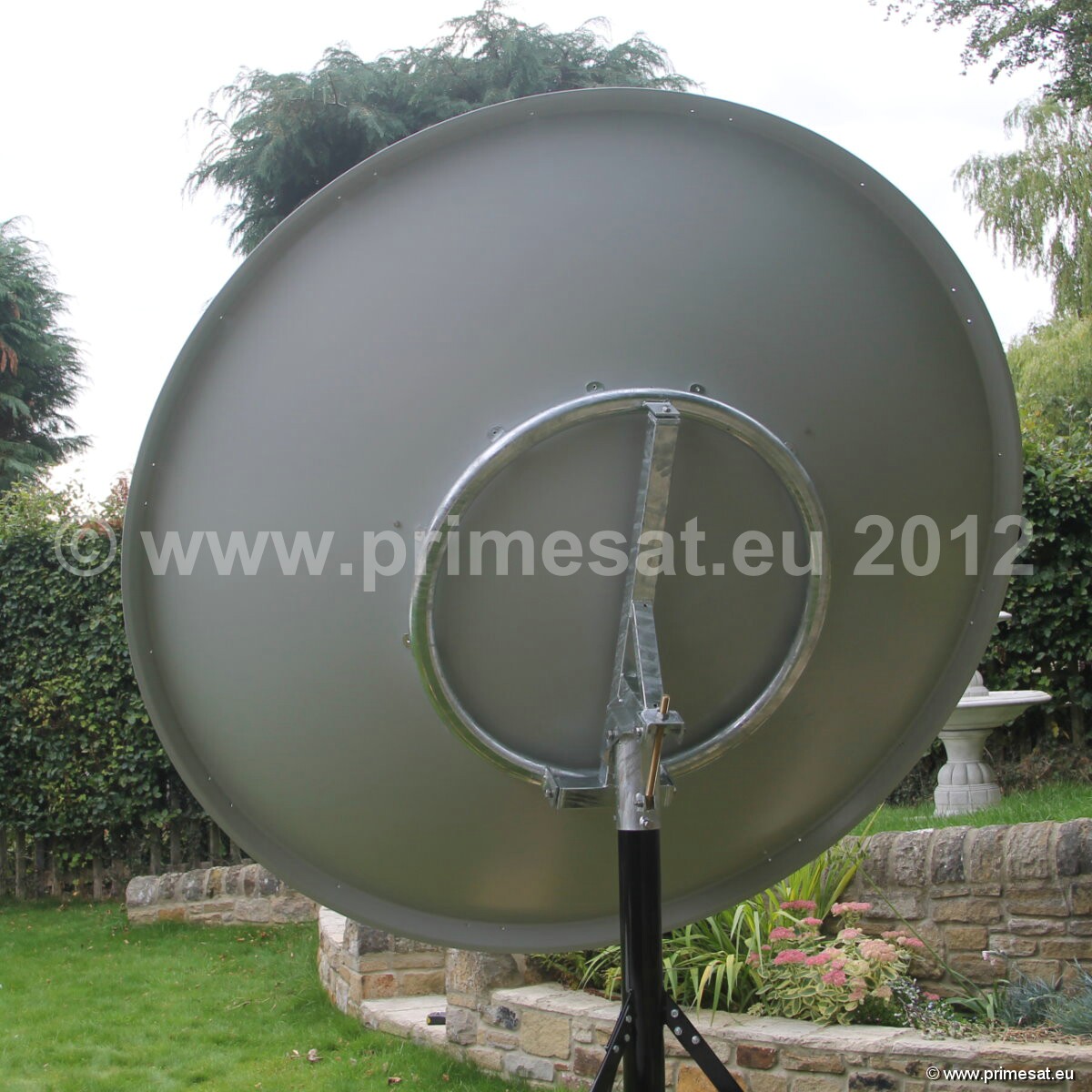 Primesat P23FIX 2.3m prime focus fixed dish. Specifications as per technical data above.The fixed version is shown in the pictures.The fixed version uses the same reflector and a galvanised AZEL mount with a collar for a 100mm poleAn optional Primesat ground stand with a 100mm diameter pole and at 1.4m high is also available. 24 bolt fixing.Again stainless steel bolts, nuts and brass elevation adjusters are used. See pictures on the left.