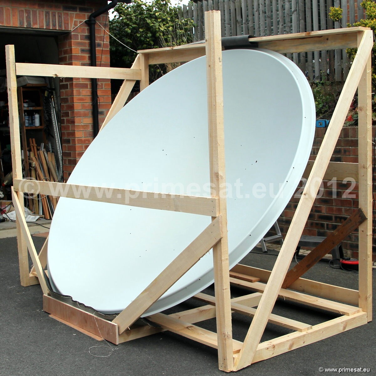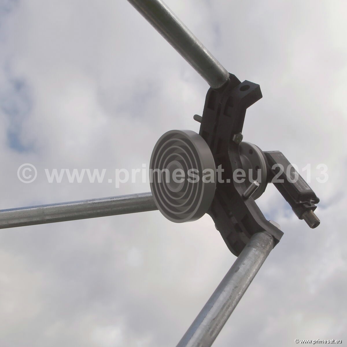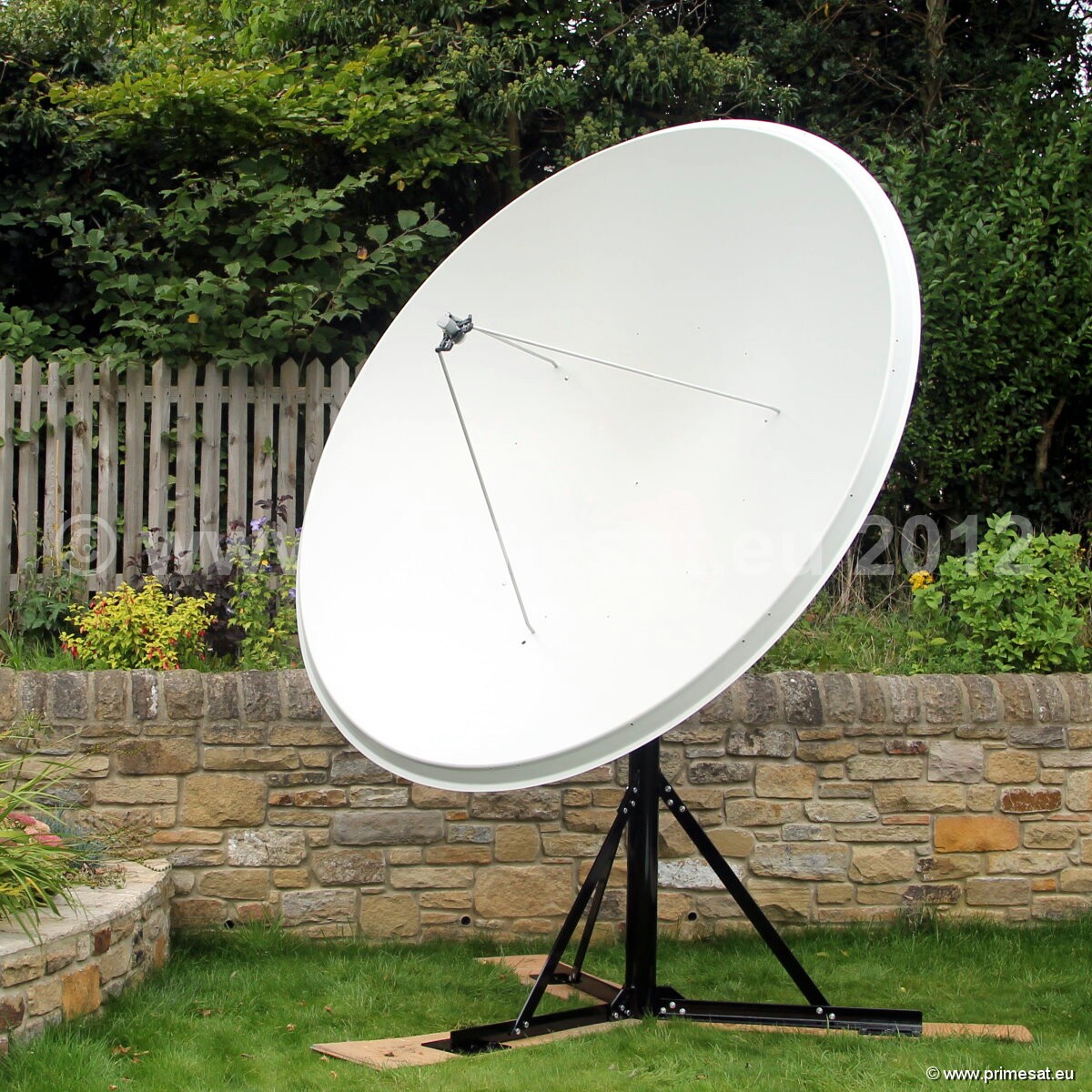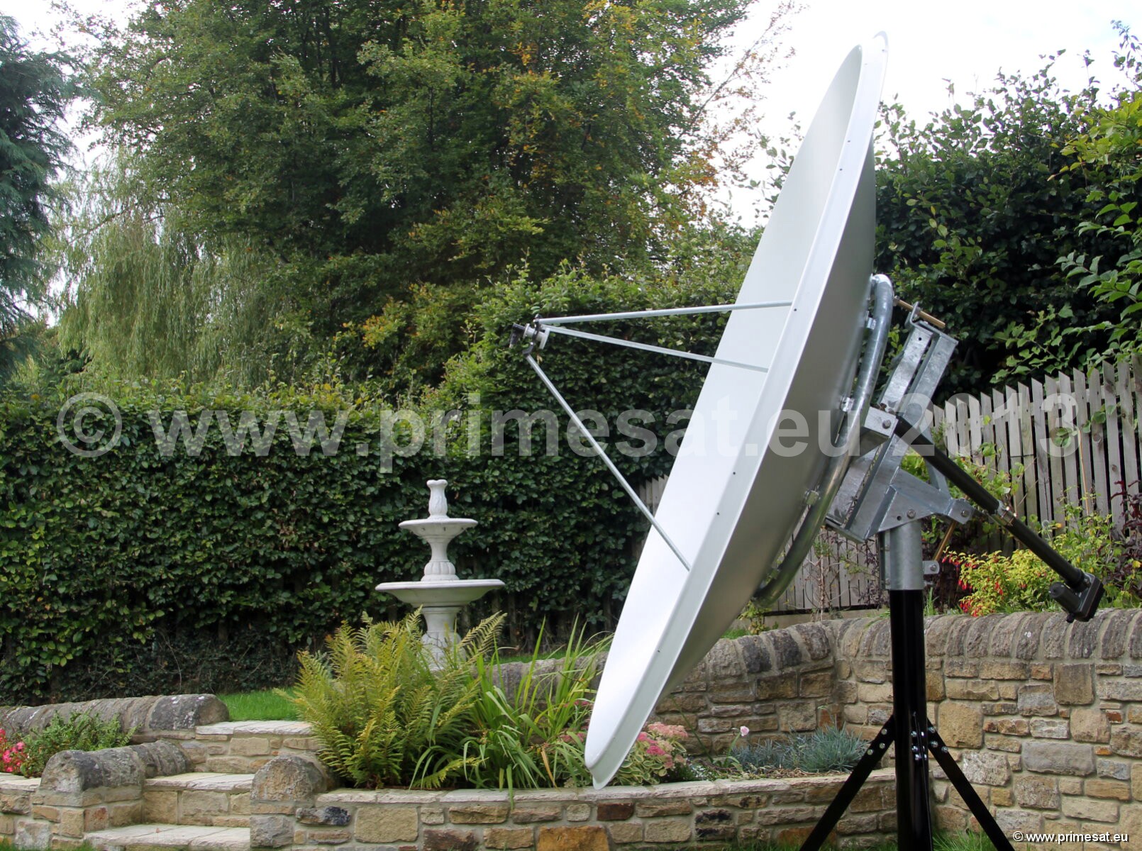 Primesat P23FIX 2.3m prime focus fixed dish. Specifications as per technical data above.The fixed version is shown in the pictures.The fixed version uses the same reflector and a galvanised AZEL mount with a collar for a 100mm poleAn optional Primesat ground stand with a 100mm diameter pole and at 1.4m high is also available. 24 bolt fixing.Again stainless steel bolts, nuts and brass elevation adjusters are used. See pictures on the left.