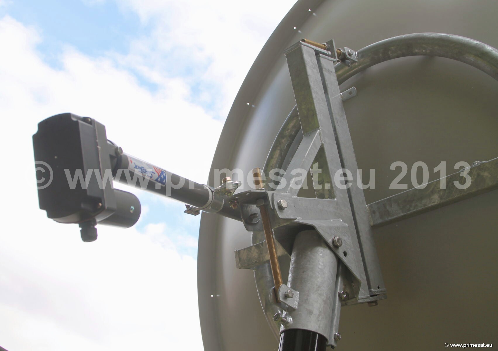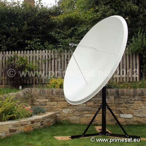 Primesat P23MOT 2.3m prime focus motorised dish. At last a high gain high quality prime focus dish.In the early days of satellite most dishes were prime focus. These days most dishes are offset.This is two ways of doing the same job but prime focus dishes point upwards and look purposeful.From the appearance point of view they are usually the enthusiast's favorite. This one ismade of aluminuim and is one piece. (As a general rule, aluminium is preferable to steeland 1-piece tends to be more efficient that "petalised" or segments.) This attractive dishcomes complete with a very heavy duty polar mount, a prime focus Primesat matched feedhornand Inverto LNB. The polar mount is "dipped galvanised" which is the best possible type of treatment for withstanding corrosion in high salt areas. Everything about this dish is high quality. All of the nuts and bolts are made of stainless steel. The elevation adjusters are made of brass.An optional Primesat ground stand with a 100mm diameter pole and at 1.4m high is also available. 24 bolt fixing.